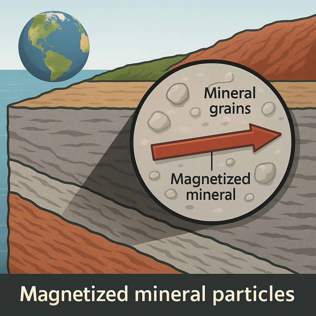 퇴적물이 쌓일 때, 자성 입자가 지구 자기장의 방향에 따라 정렬되면서 퇴적층 내에 자기 기록이 남습니다.