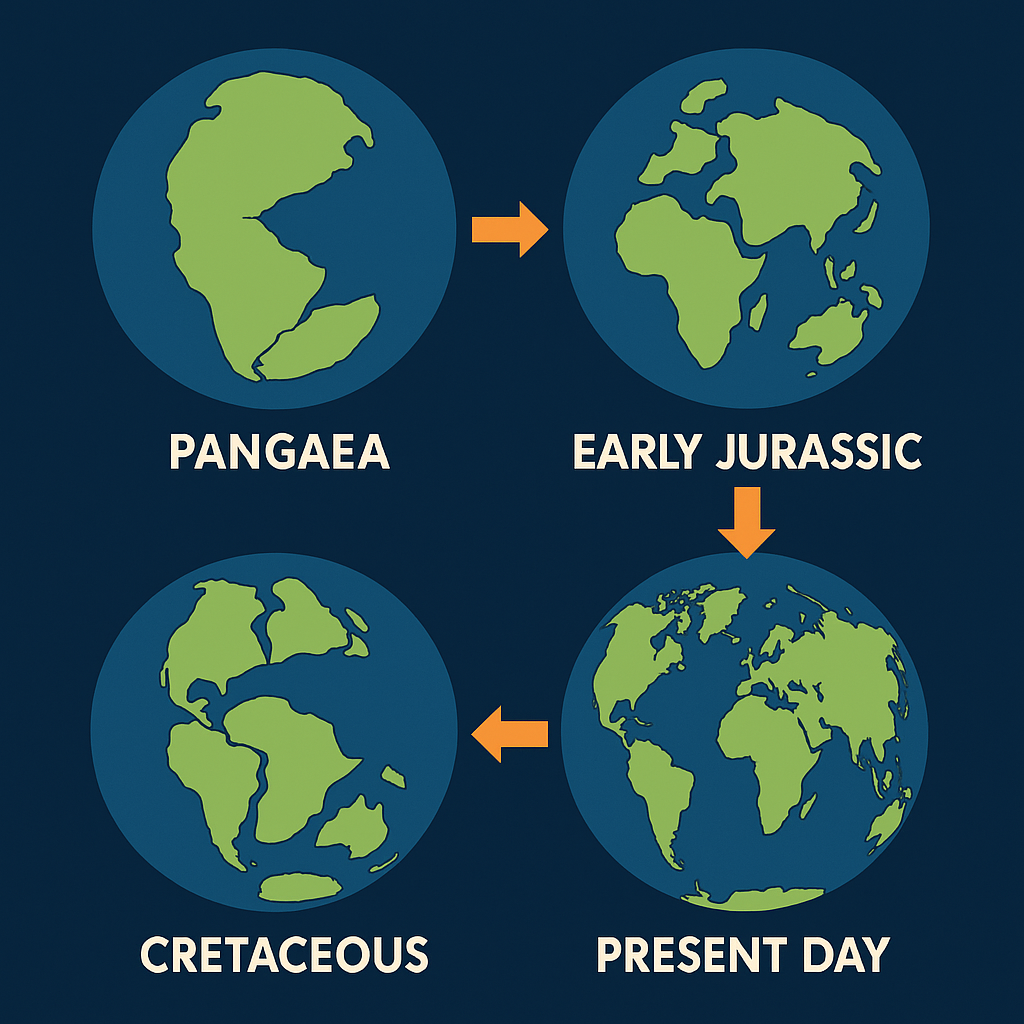 • 판게아 분열 → 대륙들이 각기 떨어짐 → 지리적 격리(Allopatric speciation)