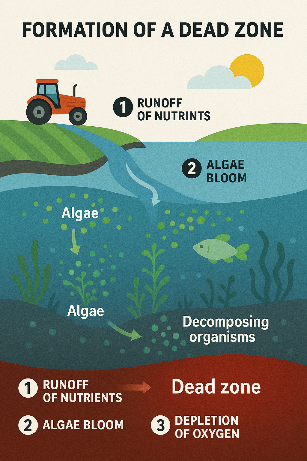 데드 존은 단순한 해양 오염이 아니라, 연쇄적인 생태계 위기를 유발합니다: